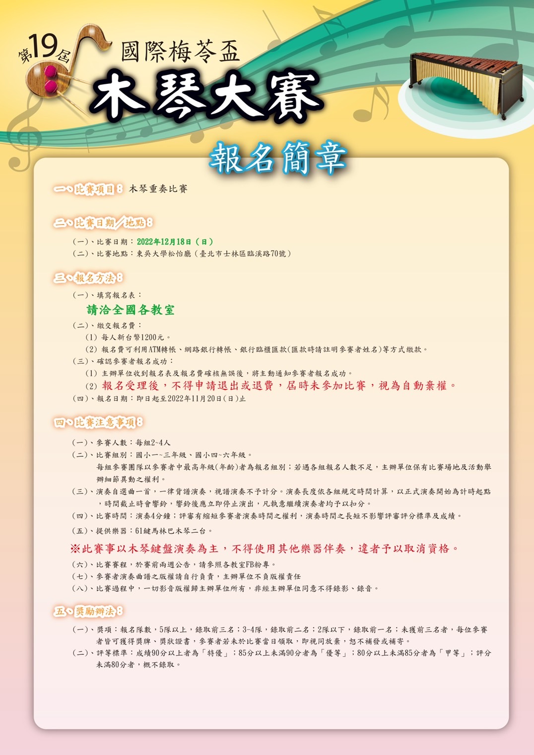 本次眾所注目的『第19屆國際梅苓盃-木琴大賽』,孩子們除了可以參加『木琴獨奏比賽』,現在系統推出『木琴重奏大賽』,歡迎學員們踴躍參加報名!